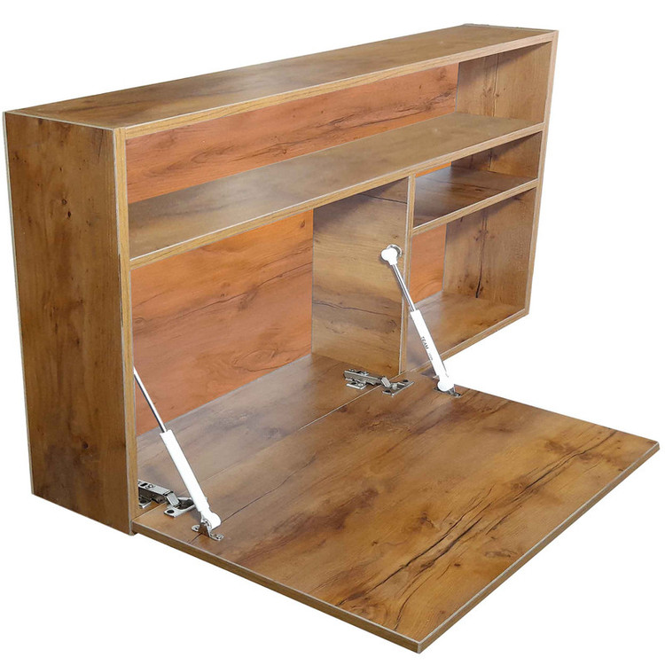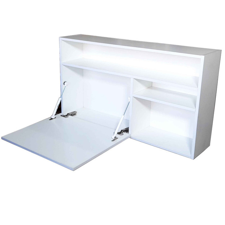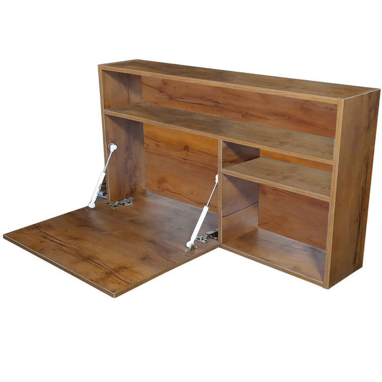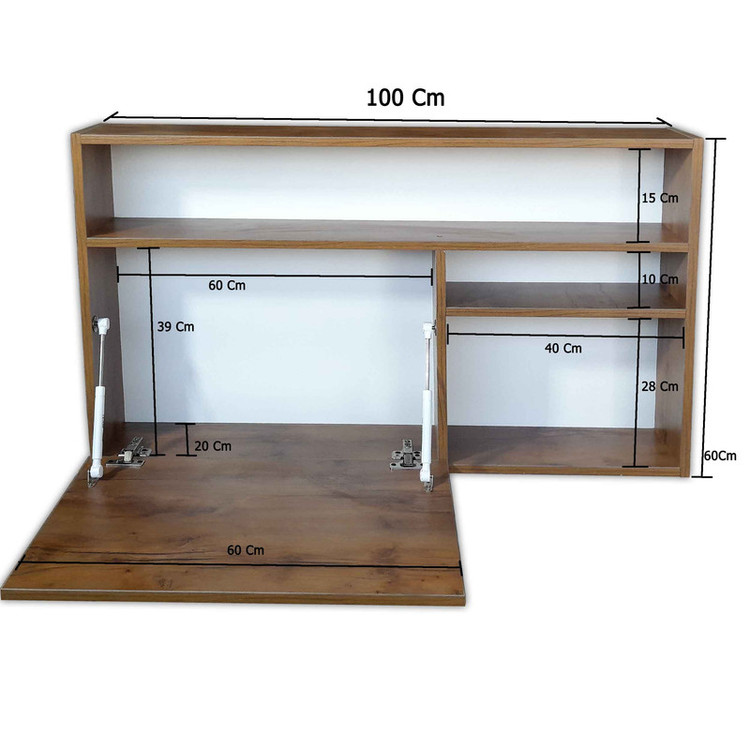 میز تحریر دیواری با درب جمع شونده دارای 2 جک 100 نیوتنی دارای 2 عدد لولا گازور پمپی قابلیت استفاده به عنوان کتابخانه دیواری قابلیت جاگیری لپتاب و کیبورد دارای تحمل وزن بالای درب با قابلیت تحمل وزن دست ، کتاب و لپتاب