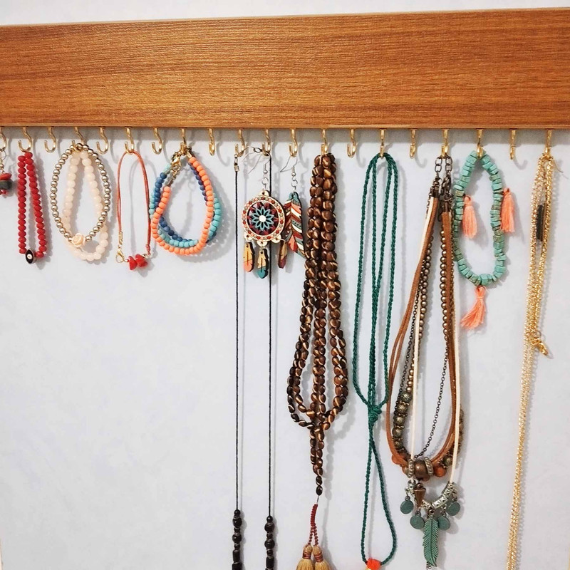 دیوار کوب زیورالات مدل 50سانتی مجهز به دو گیره پشتی برای نصب راحت به دیوار باپشت درب کمد شما بوده و تعداد 16 گیره زیبا برای آویزان کردن زیور آلات شما دارد